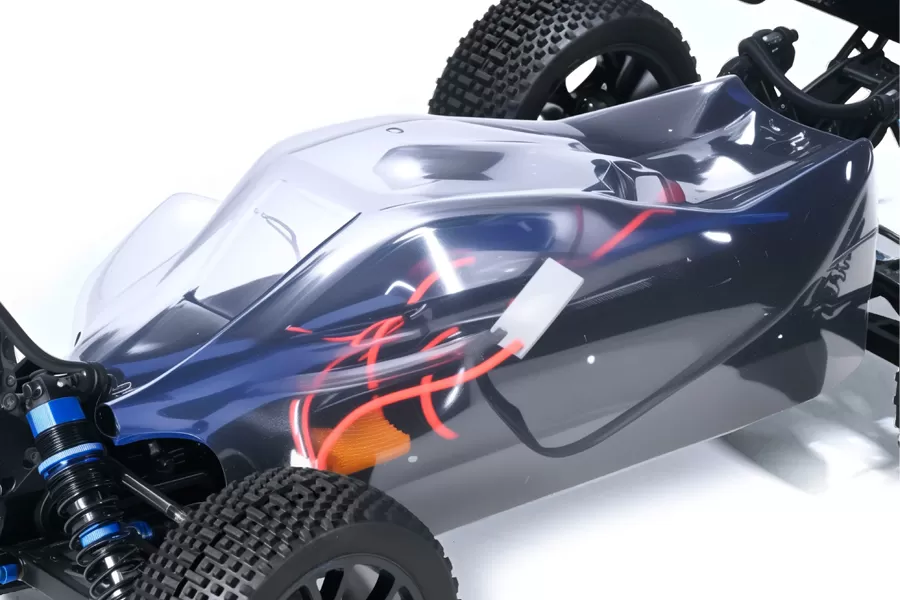 O buggy Blast BX rc vem com um design de chassi plano de uma peça para CG baixo, garantindo que as rodas internas e externas giram em diferentes velocidades durante as curvas, aumentando o manuseio e a estabilidade, se adaptando a várias superfícies:, e ajuda o carro a ter um melhor desempenho em diferentes terrenos. Enquanto isso, ele adiciona diff central como a maioria dos buggy 1/8 para proteger as engrenagens e apoiar a longa distância entre eixos. O BX vresion oferece um corpo dinâmico e uma asa traseira de plástico para
